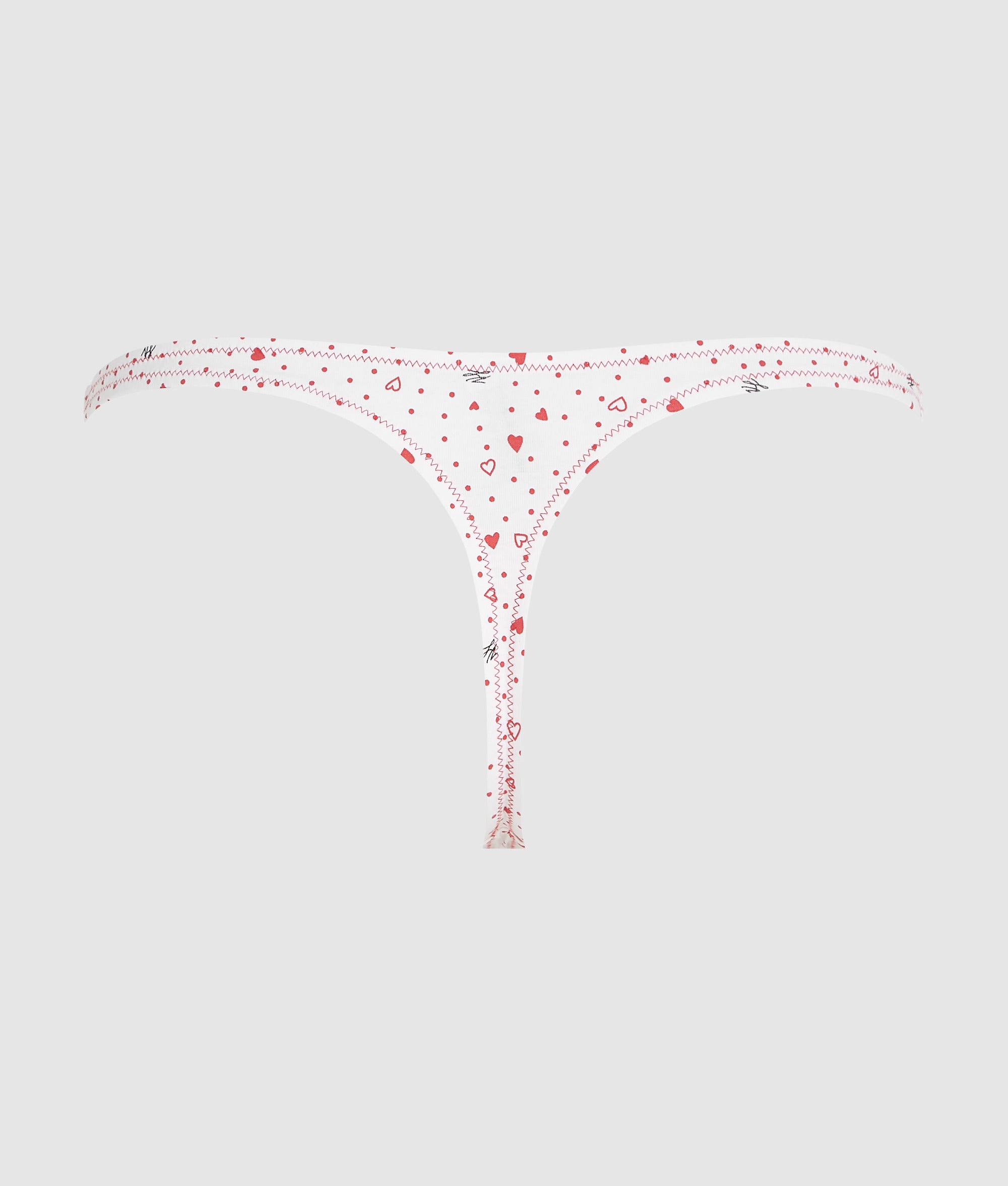 Delicate hearts adorn this underwear essential. tracing a sleek silhouette with contrasting piping. A subtle bow adds charm to this minimal coverage thong.