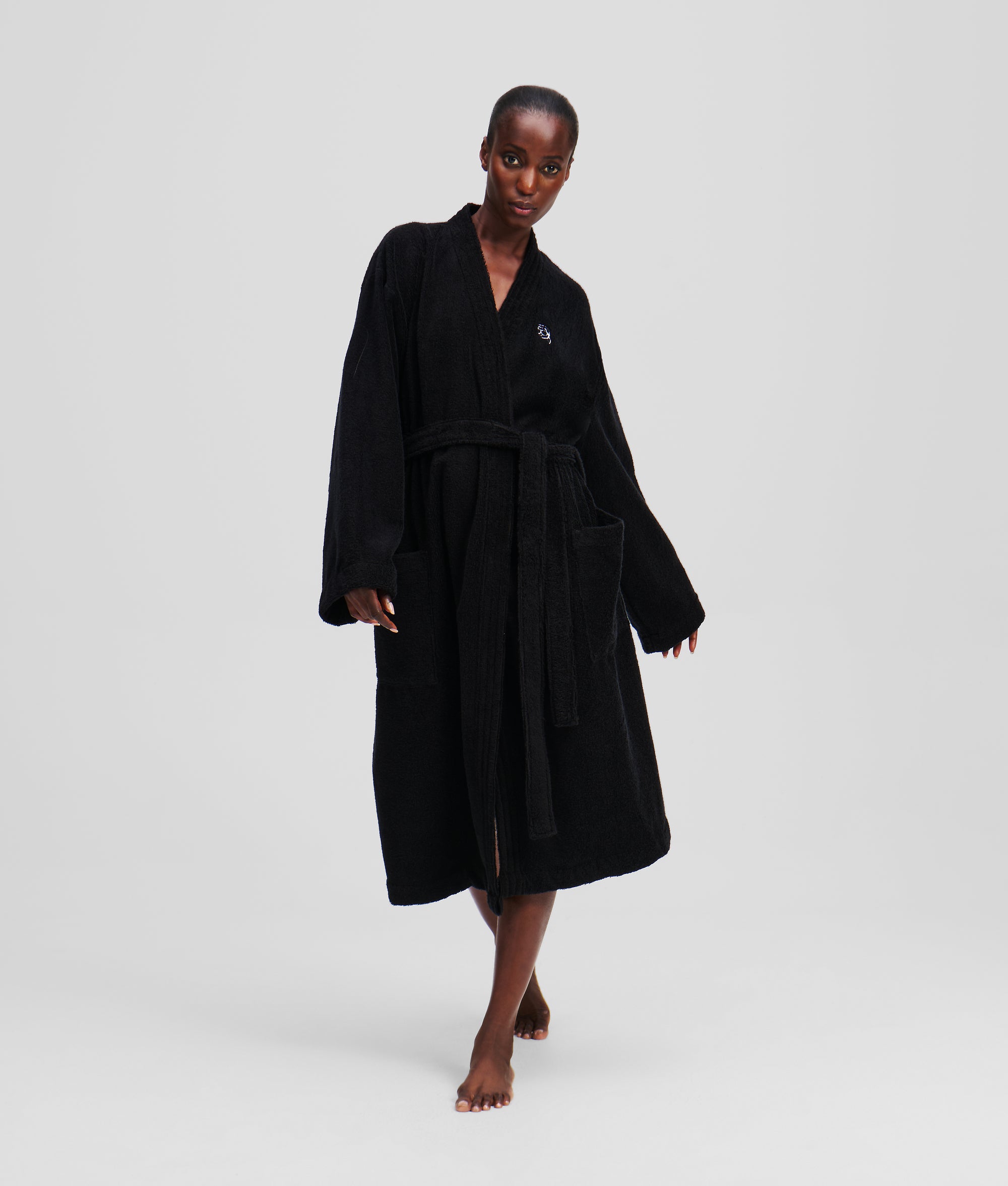 Wrap yourself in comfort with this sleek bathrobe. featuring a self-tie belt and spacious front pockets. The striking IKON Karl embroidery adds a touch of flair. perfect for lounging in style.
