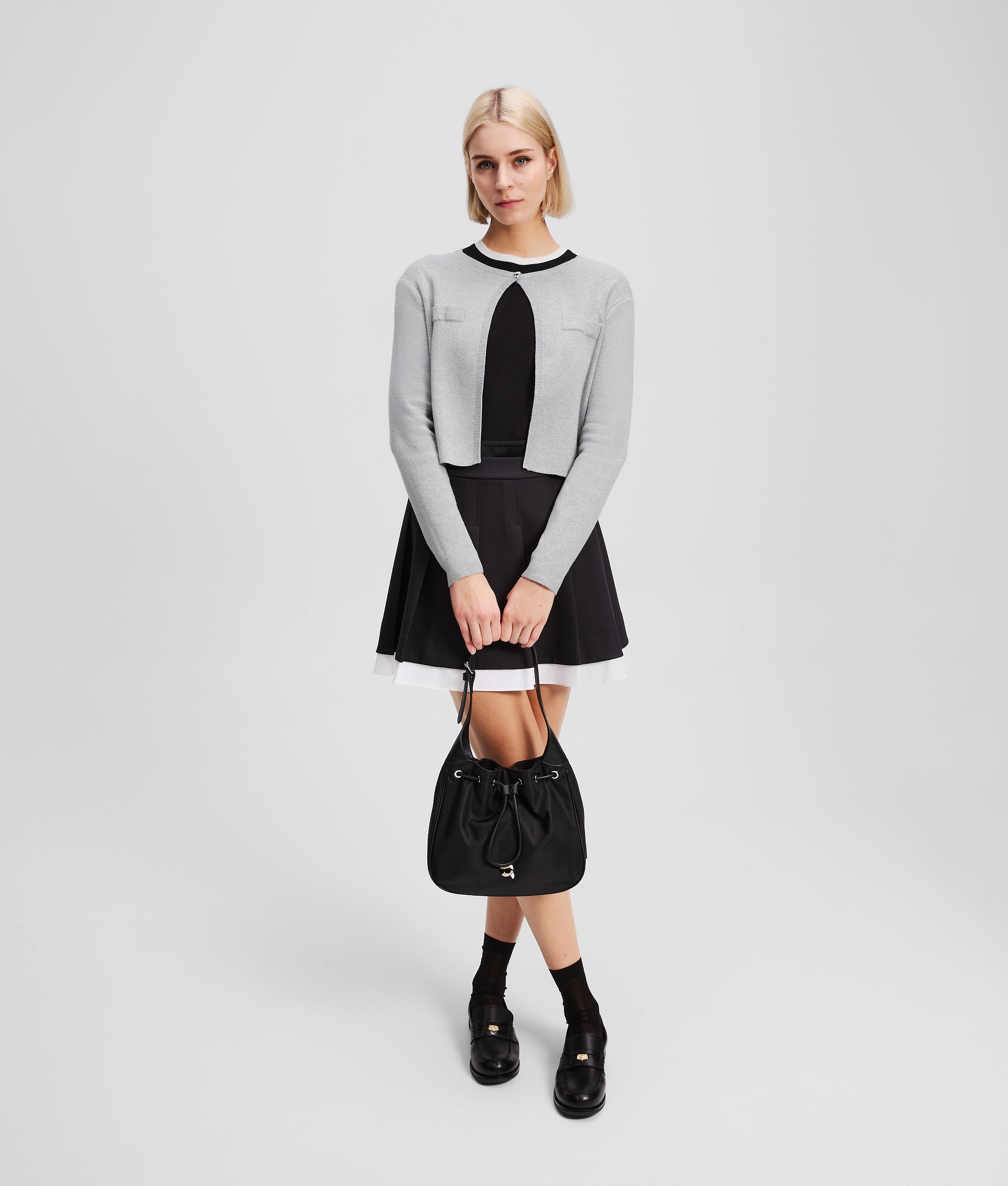 An Ikon Karl-embellished snap button at the front closure adds character to this knitwear classic. Crafted from a soft wool-blend. this cardigan offers refined sophistication and unexpected detailing to layered looks.?