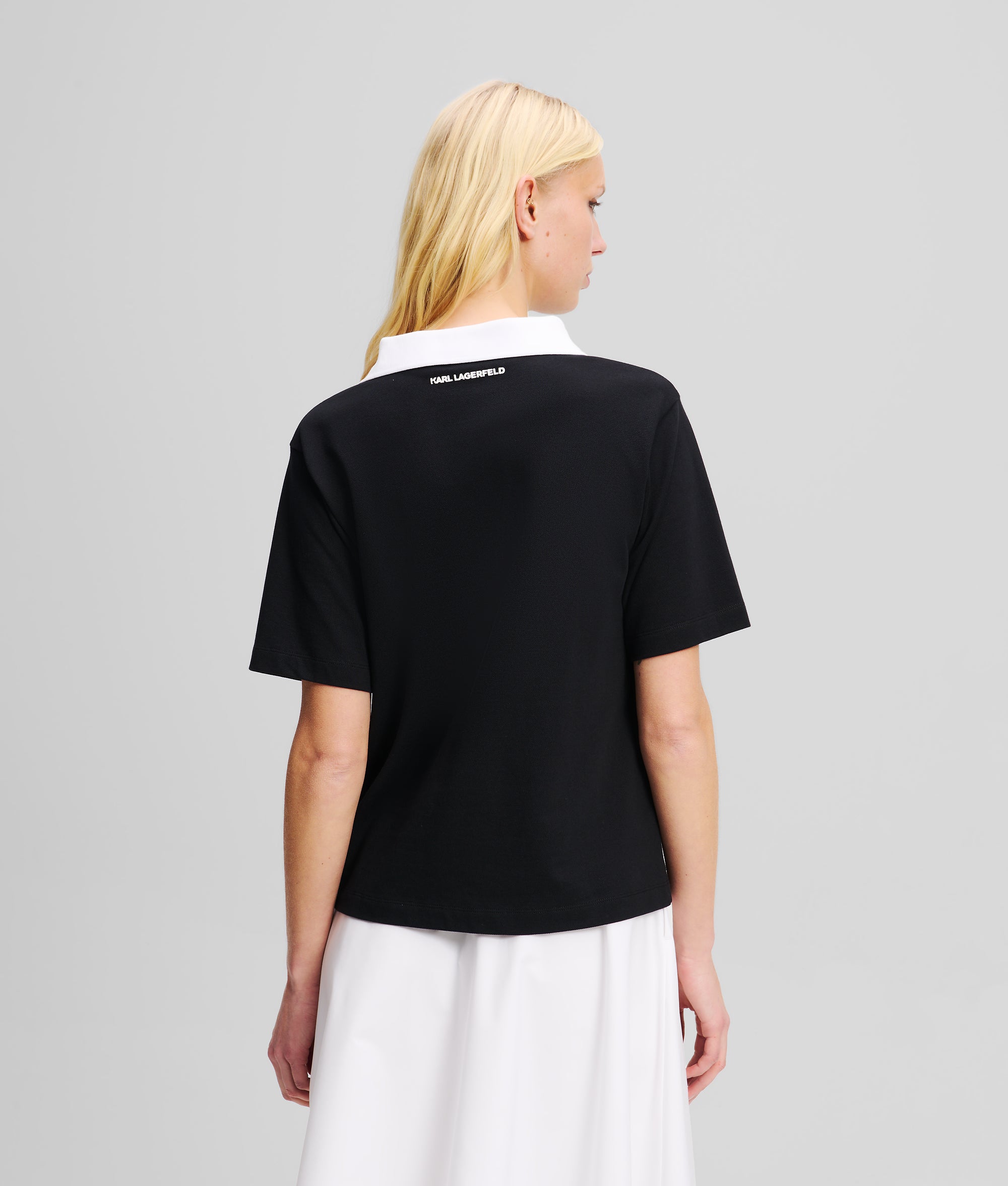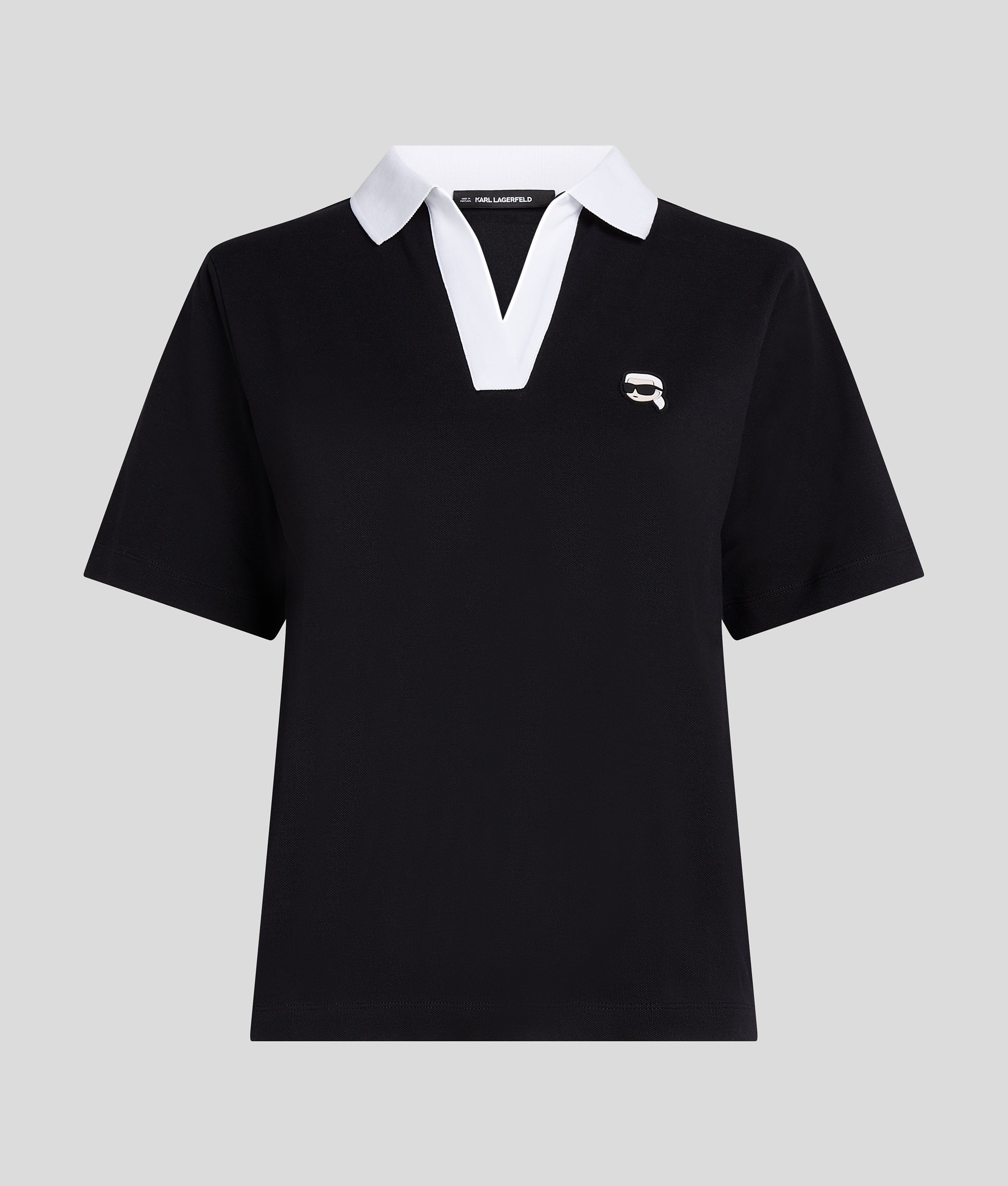 A striking polo shirt featuring a bold contrasting collar and short sleeves. adorned with a rubber IKON Karl patch. The iconic KARL LAGERFELD logo graces the back neck. ensuring a standout look.