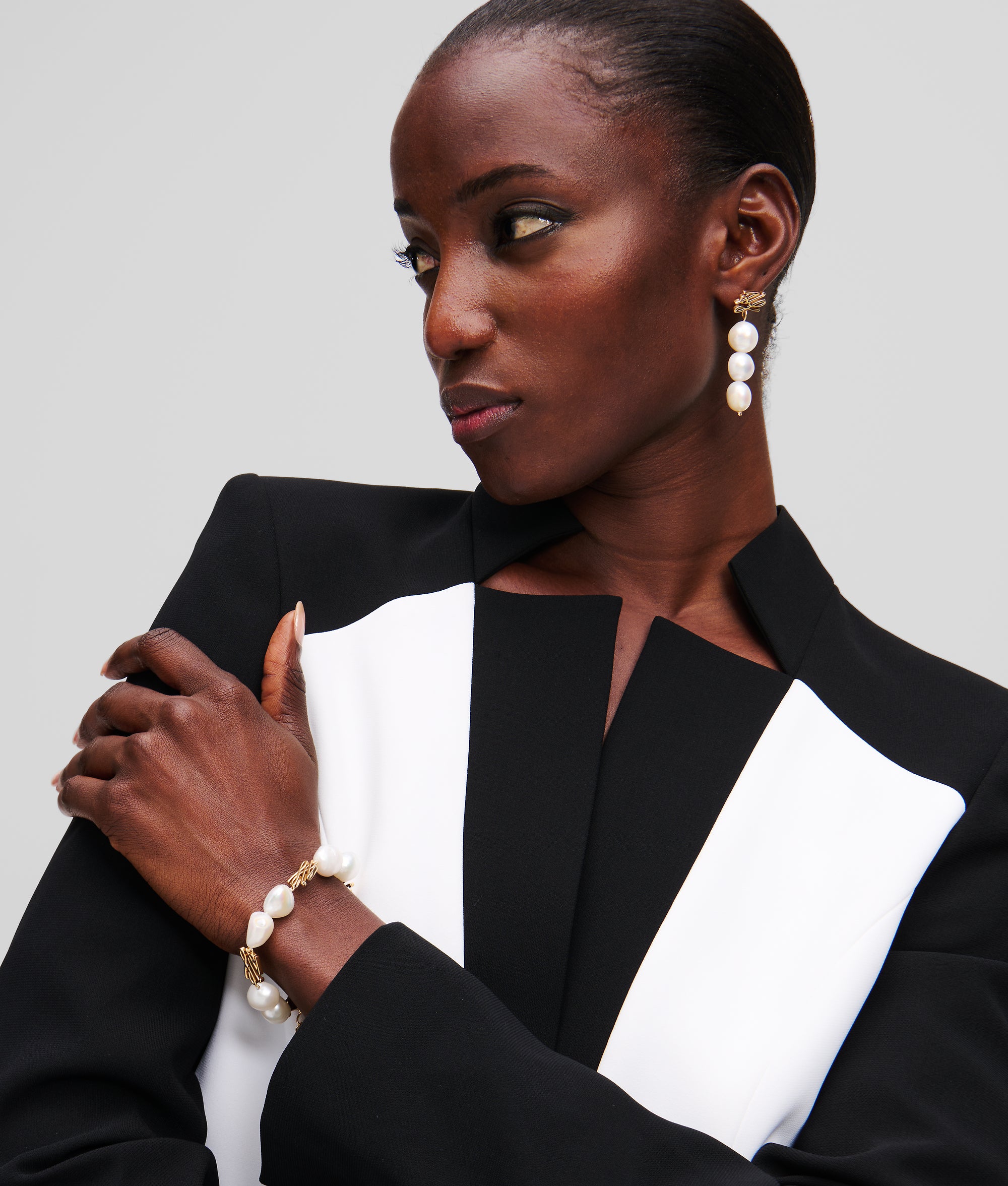 A stunning two-piece gift set featuring a pearl-strung bracelet adorned with KARL Autograph charms and complemented by matching pearl drop earrings. A timeless addition to any jewelry collection.