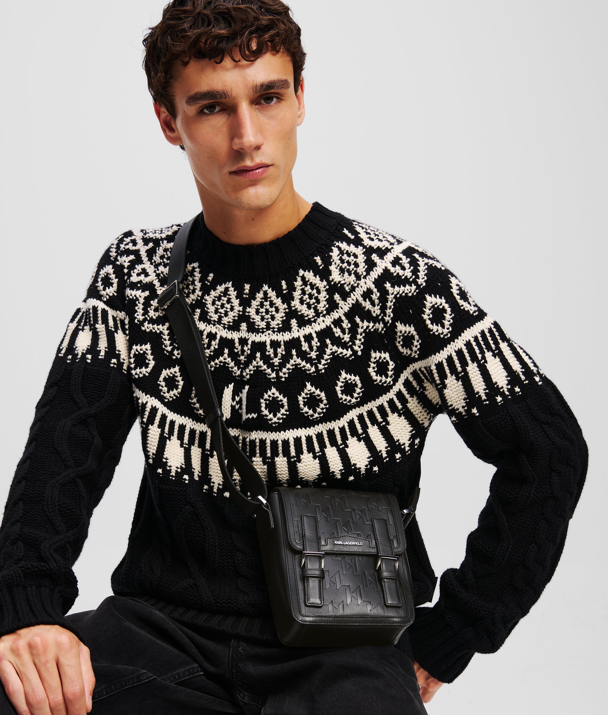 A refined crossbody bag showcasing an all-over debossed KARL Monogram design. complemented by a distinctive buckle closure. The adjustable strap offers versatility for all-day wear.