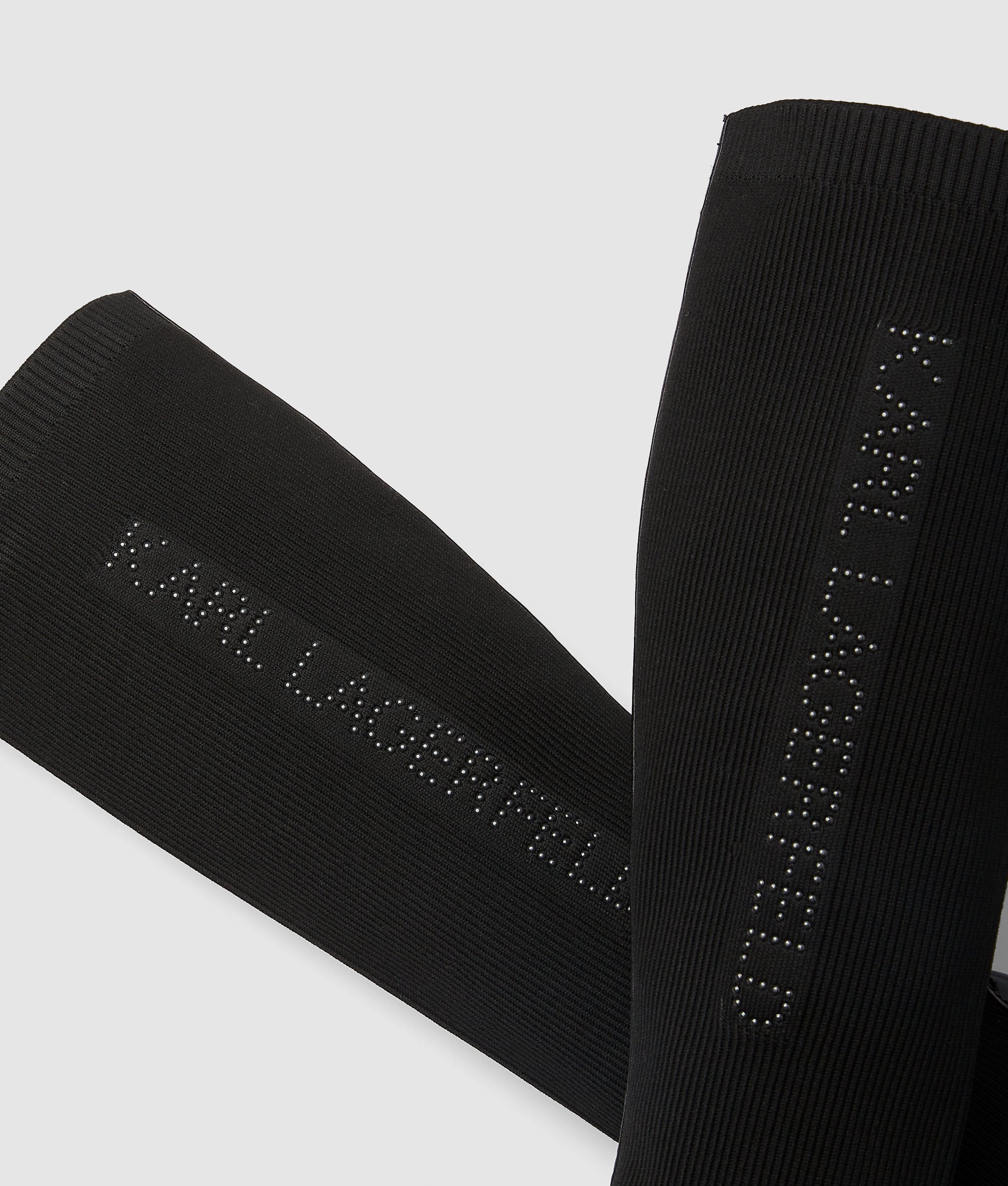 Blending sophistication and edge. these tall boots feature rock-chic stud embellishments and a contemporary mixture of leather and knit for a streamlined fit. A pointed toe and stiletto heel add to the bold look.