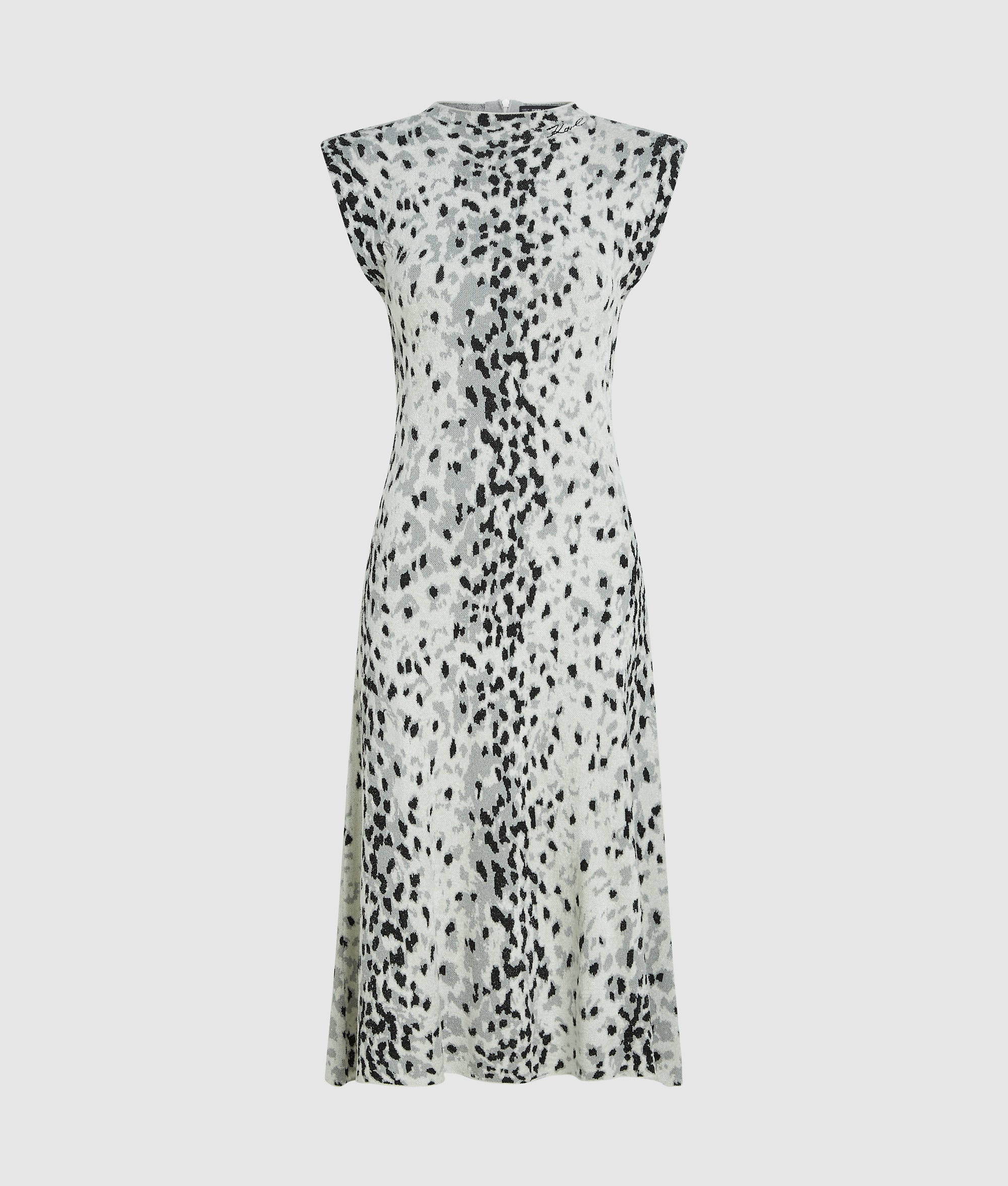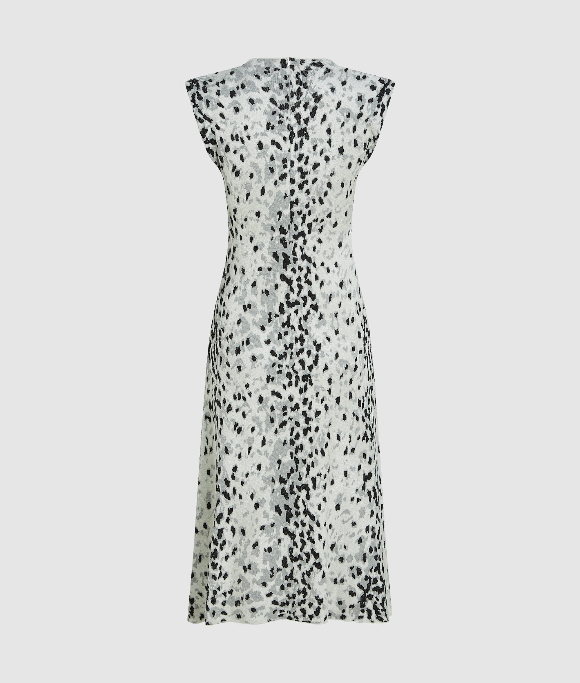 This knitted dress features an all-over. snow leopard print and a breezy sleeveless silhouette. Its midi-length. flared skirt adds lively movement for effortless style.