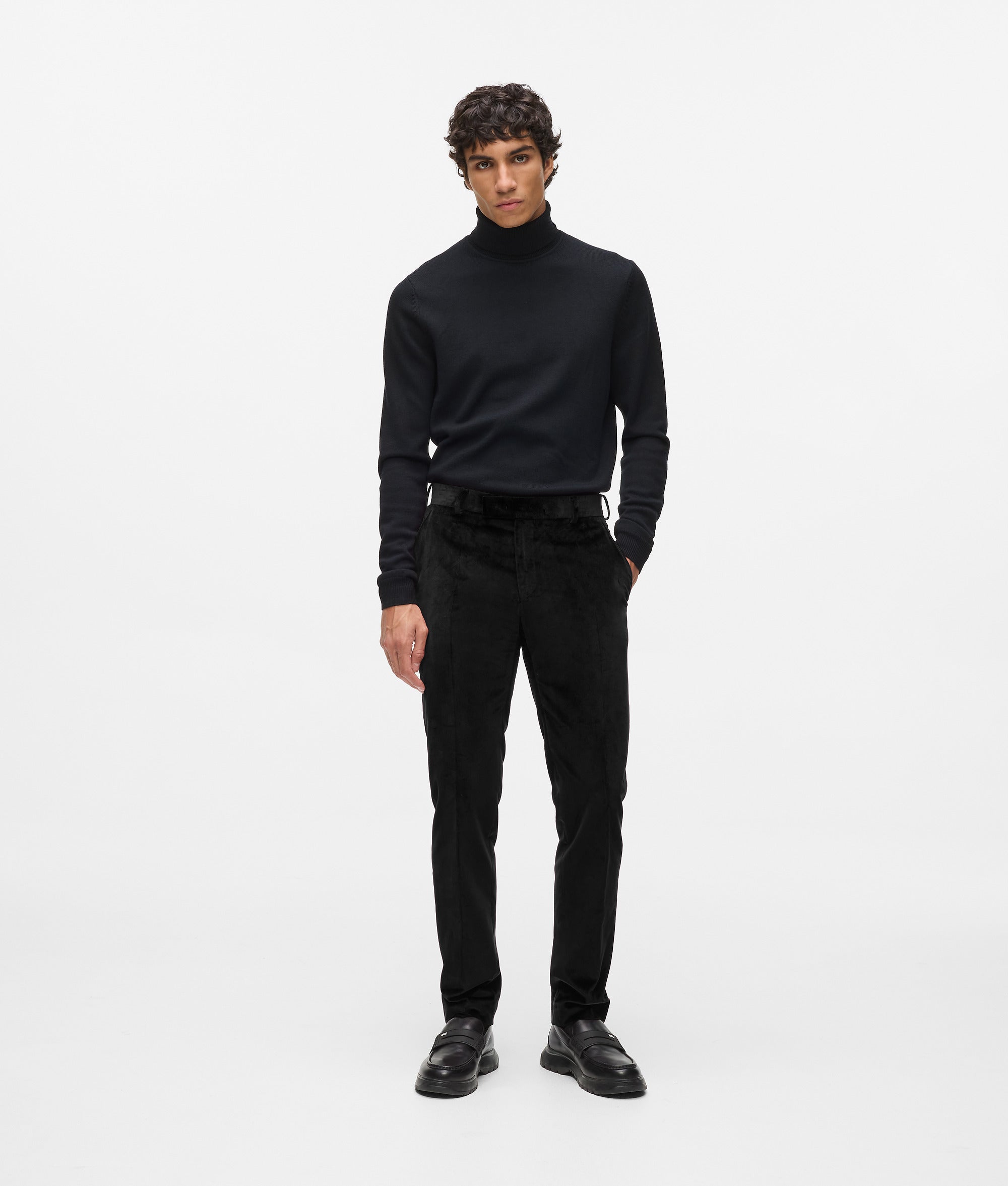These velvet pants sculpt a sleek silhouette with subtle sheen and smooth woven texture. Concealed fly and angled pockets keep the look refined and poised.