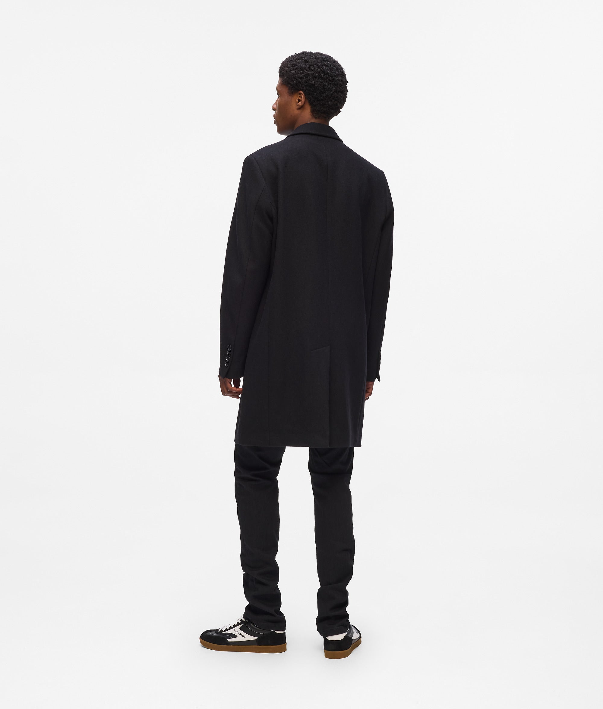A tailored silhouette brings sharp lines and structure to this classic coat. while soft wool-blend fabric offers essential warmth on chilly winter days. Twin flap pockets add subtle utility to the refined outerwear essential.