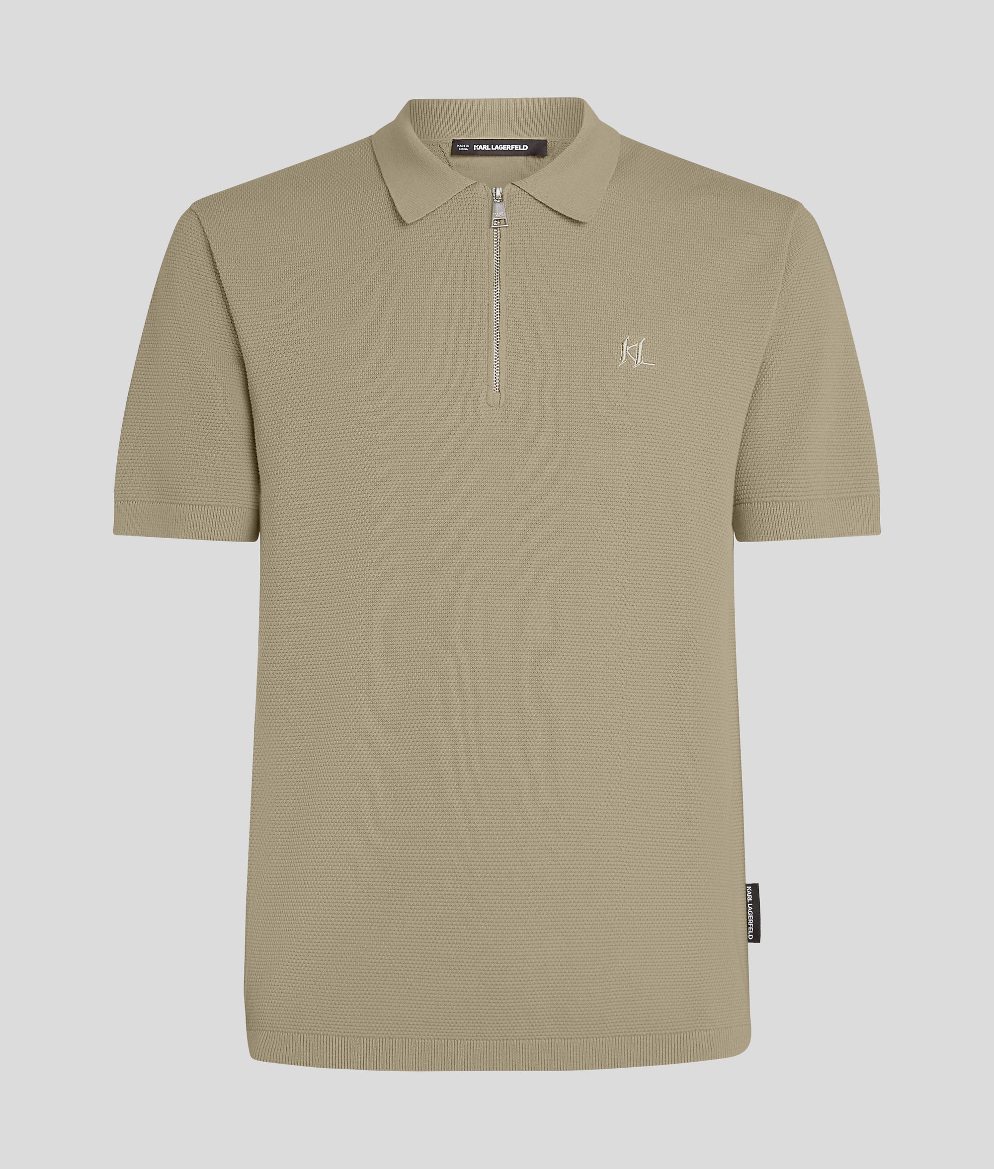 A modern twist on a classic. this polo shirt features a preppy pointed collar with an edgy zip closure. Short sleeves and ribbed details enhance its sporty vibe. while the Karl Monogram rivet adds a refined branded touch.?