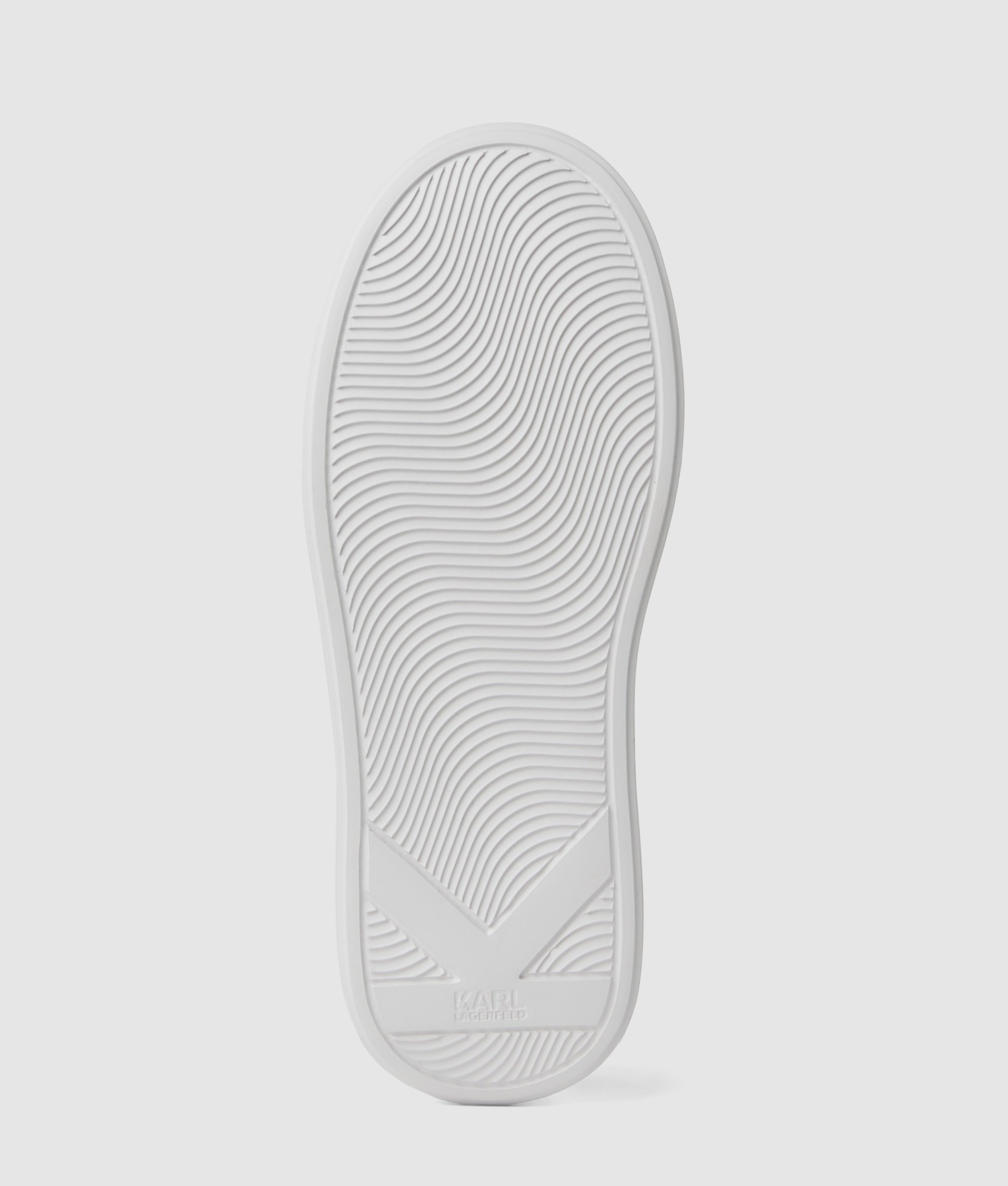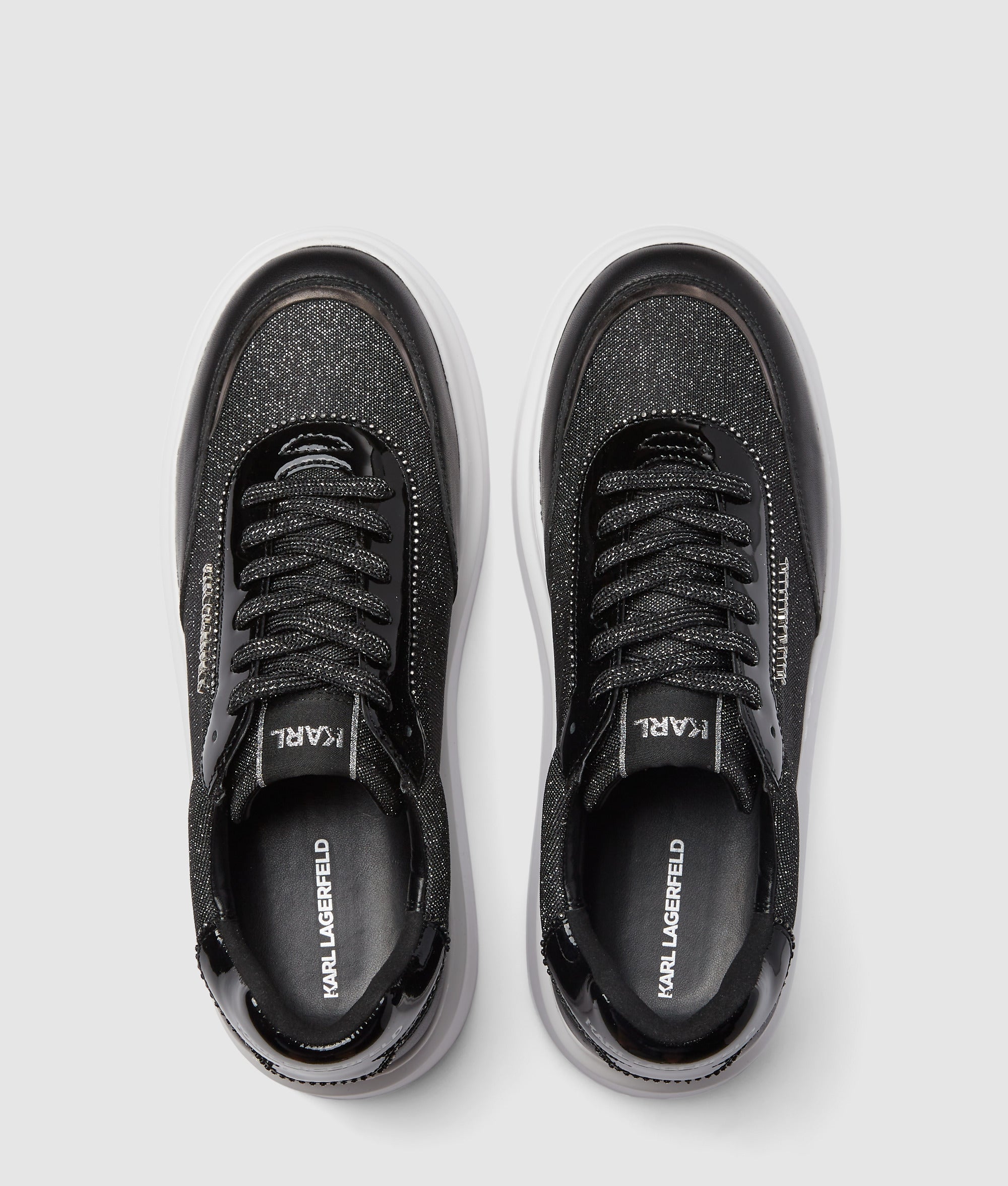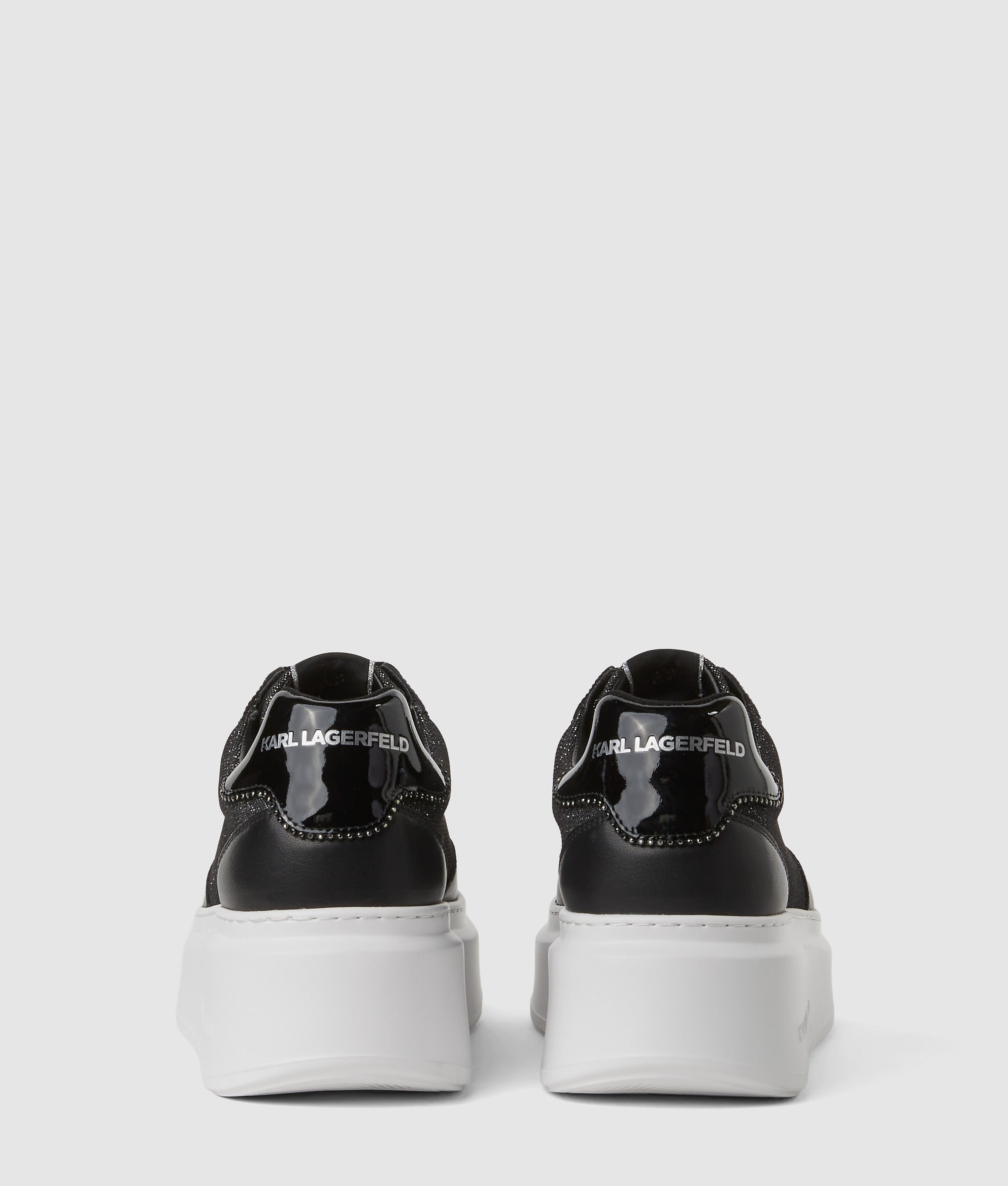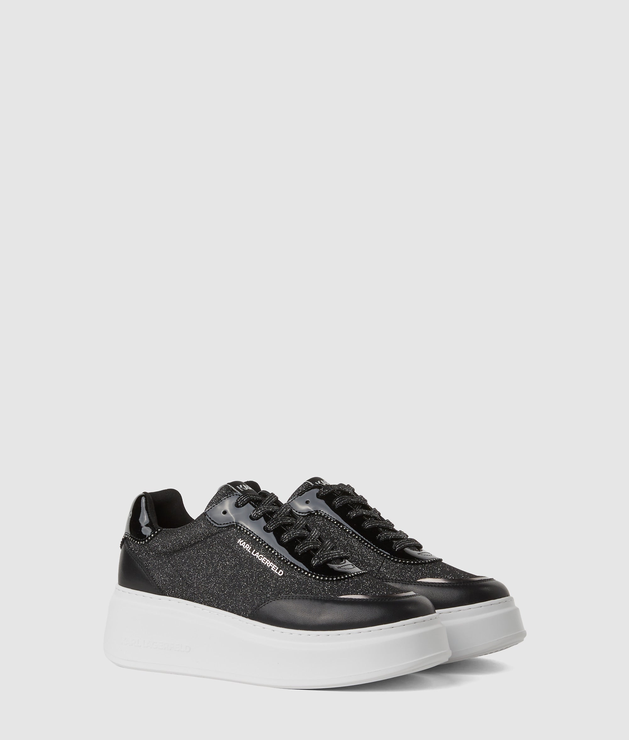 Add a touch of sparkle to casual wear with these sneakers featuring glittering panels and rhinestone detailing. A contrasting. high wedge sole and signature KARL LAGERFELD branding complete the bold design.