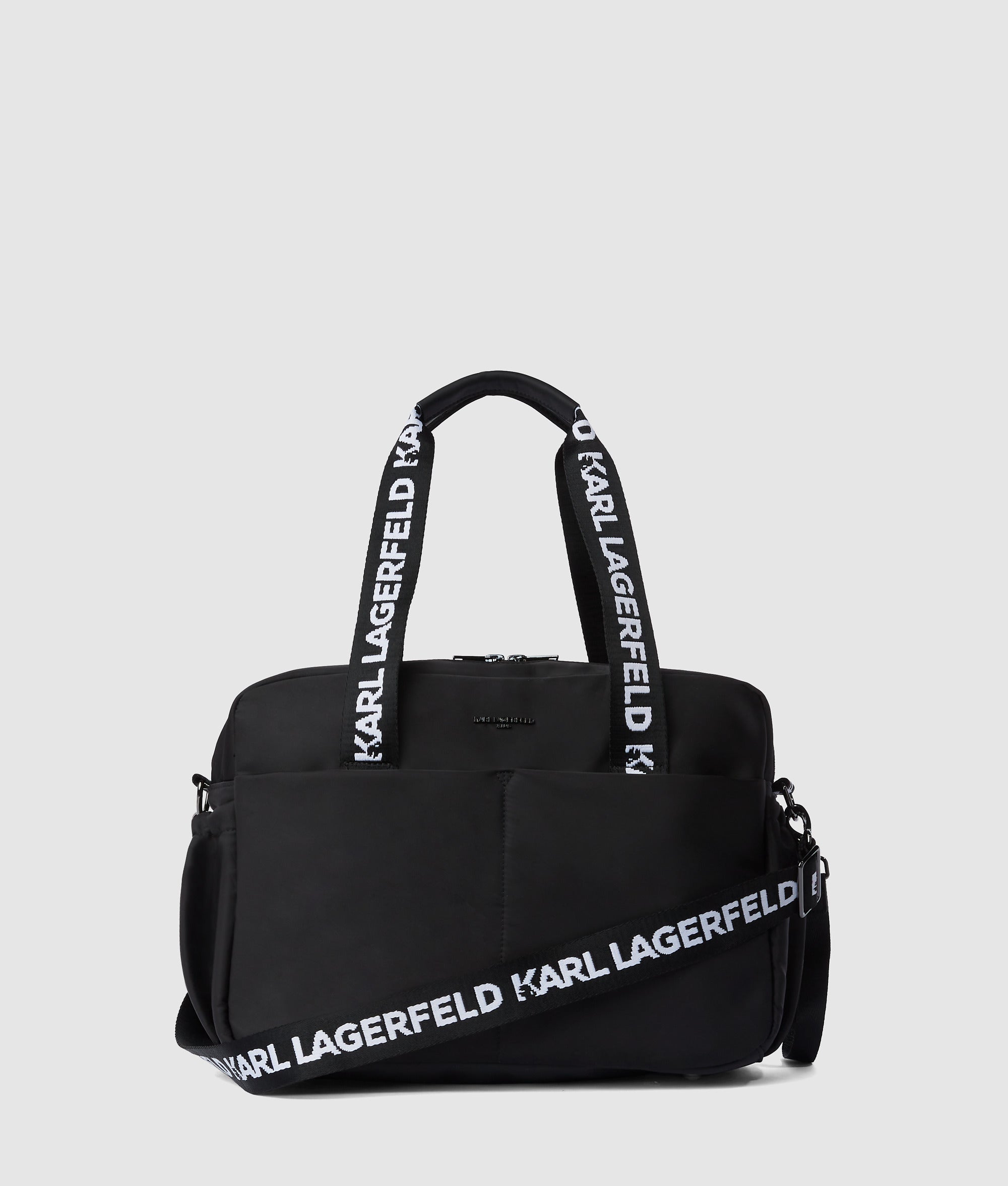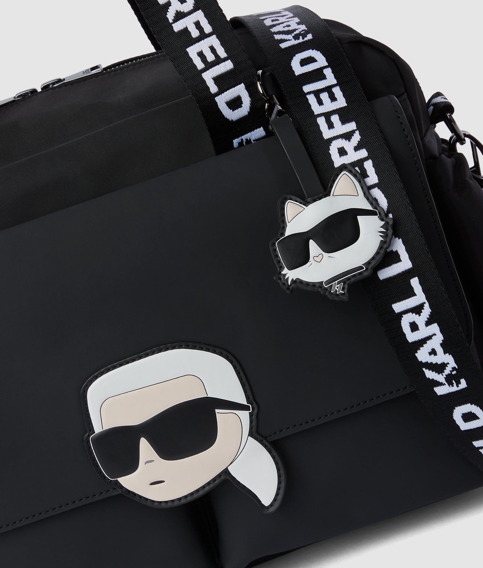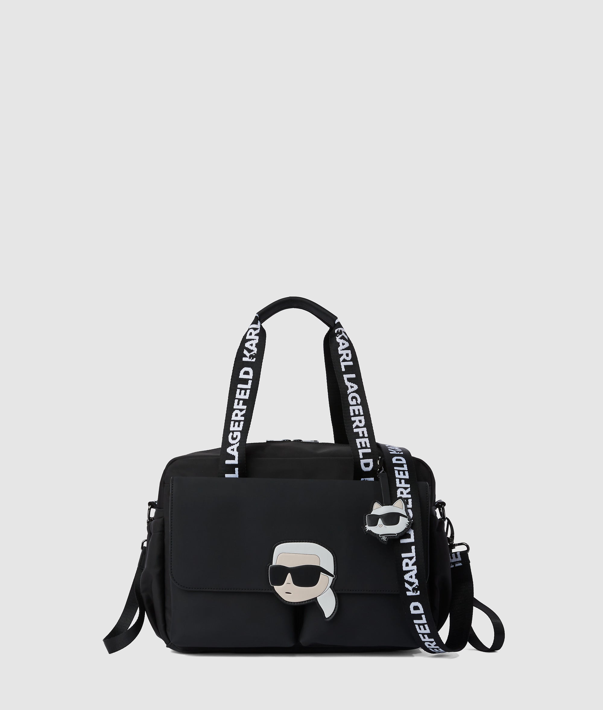 Polish meets practicality in this diaper bag. An interchangeable crossbody strap and stroller clips free up your hands. while multiple pockets keep essentials organized. Ikon Karl and Choupette charms add a playful finish.