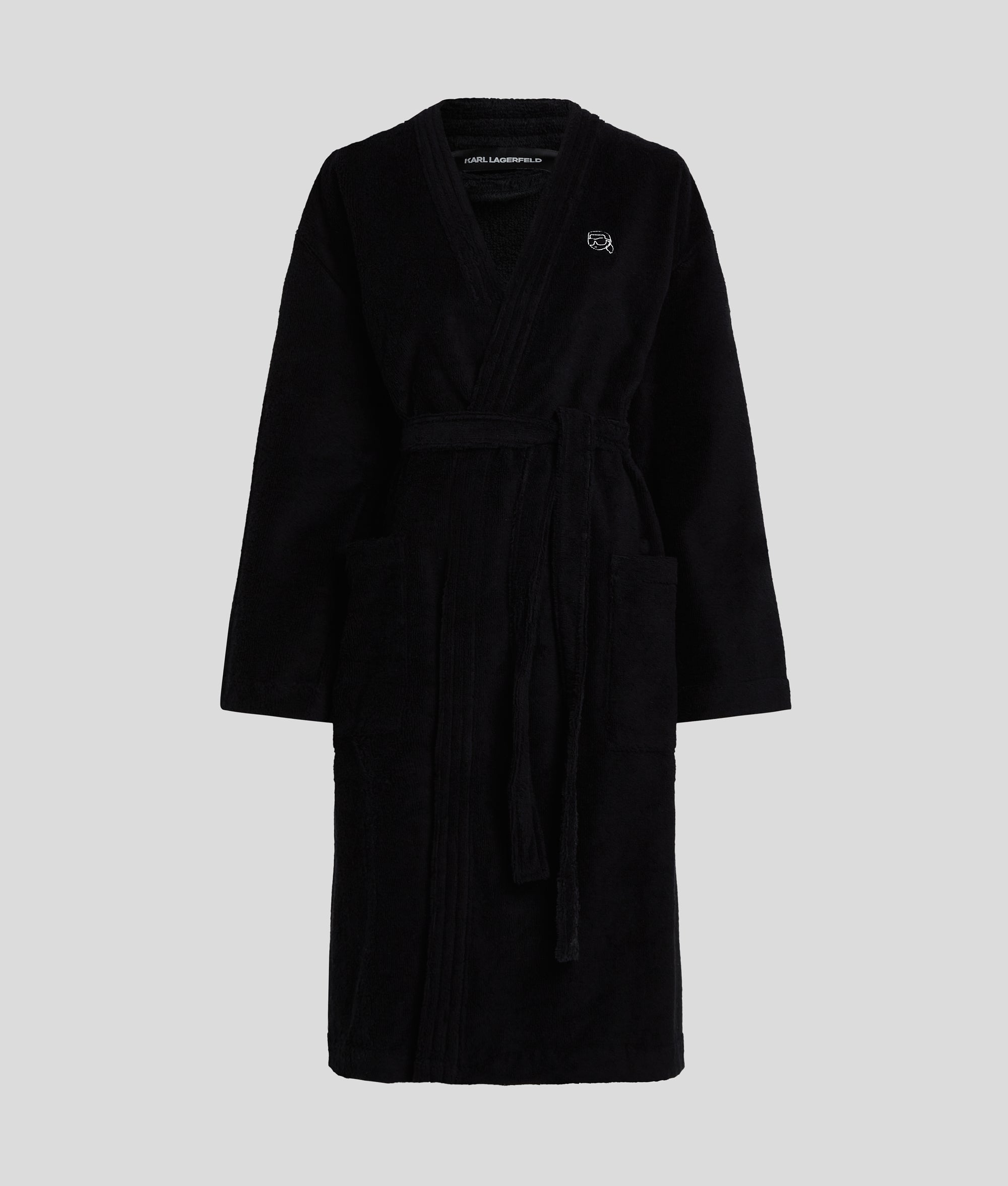 Wrap yourself in comfort with this sleek bathrobe. featuring a self-tie belt and spacious front pockets. The striking IKON Karl embroidery adds a touch of flair. perfect for lounging in style.