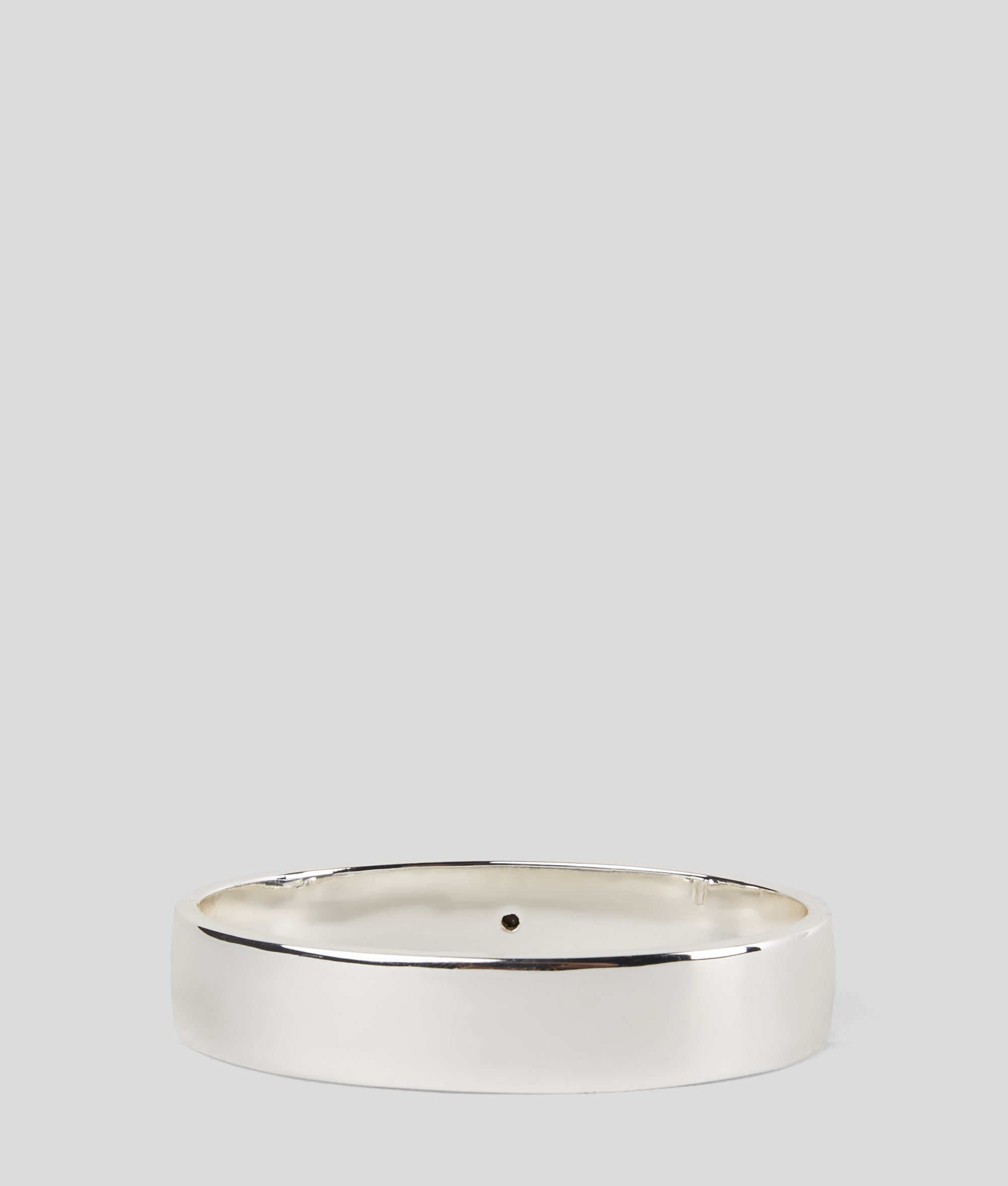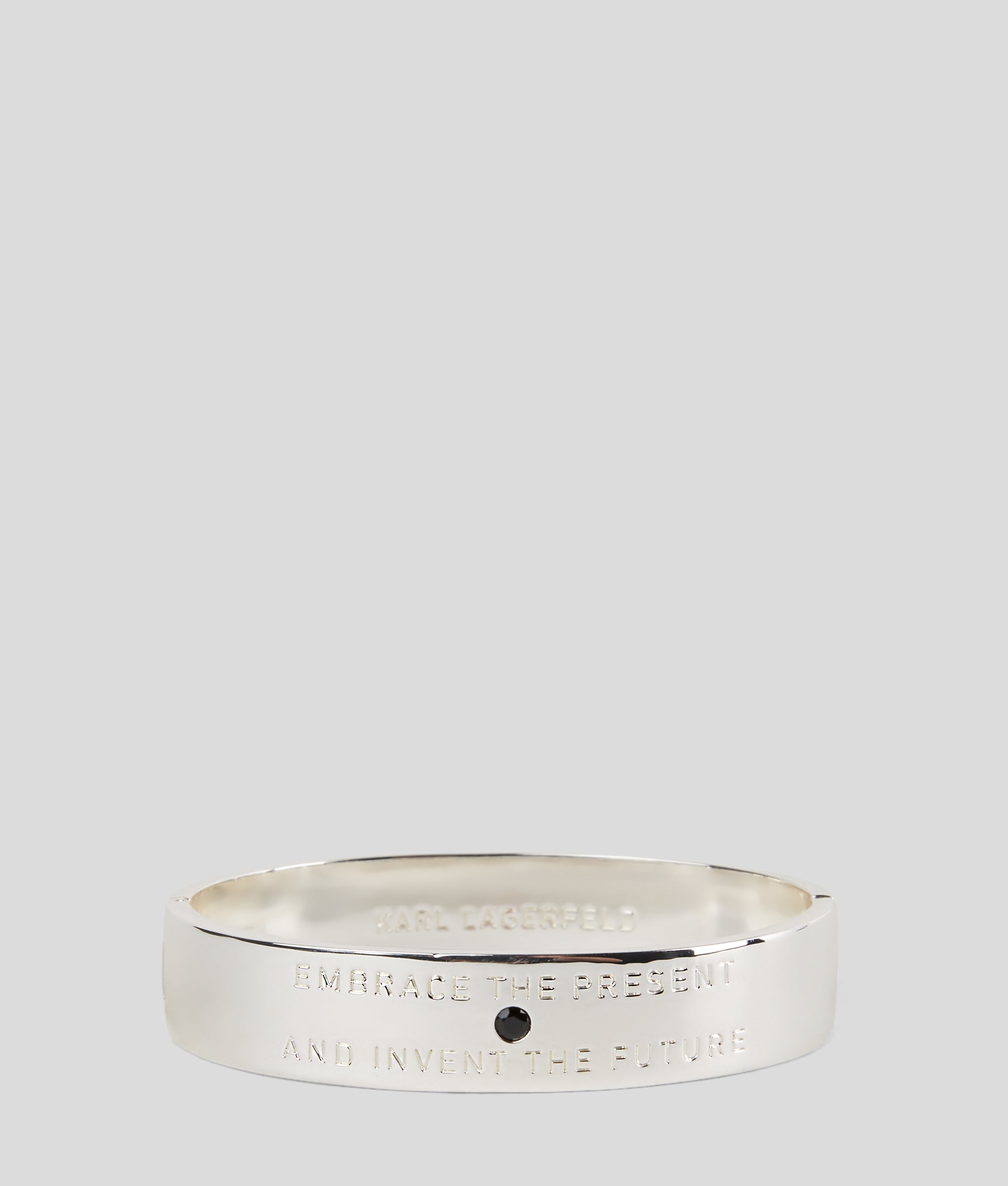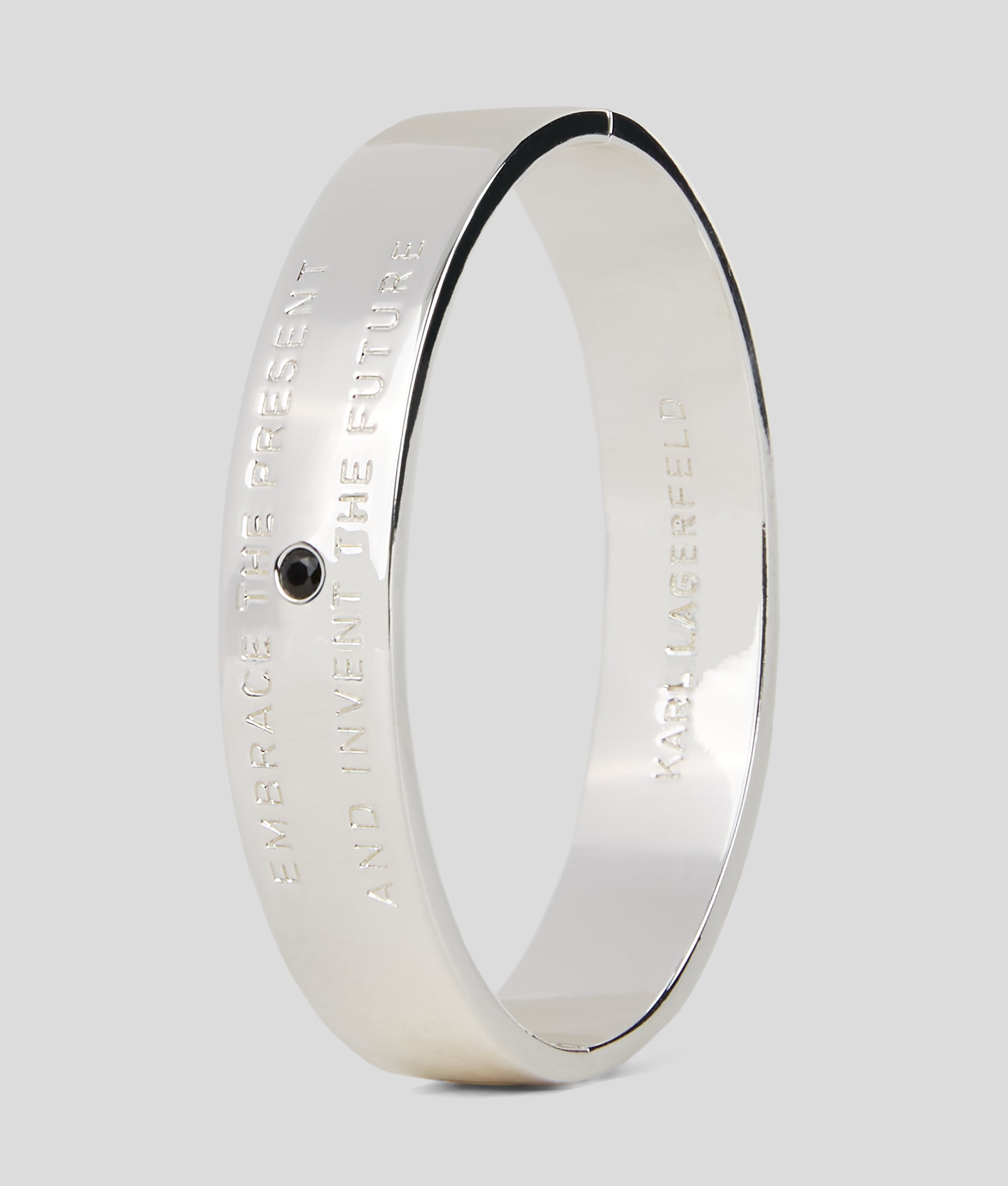 An edgy bangle featuring a secure push closure and adorned with an inspirational quote from the iconic Karl Lagerfeld at the outer band. The KARL LAGERFELD logo graces the interior. merging style with a nod to legacy.