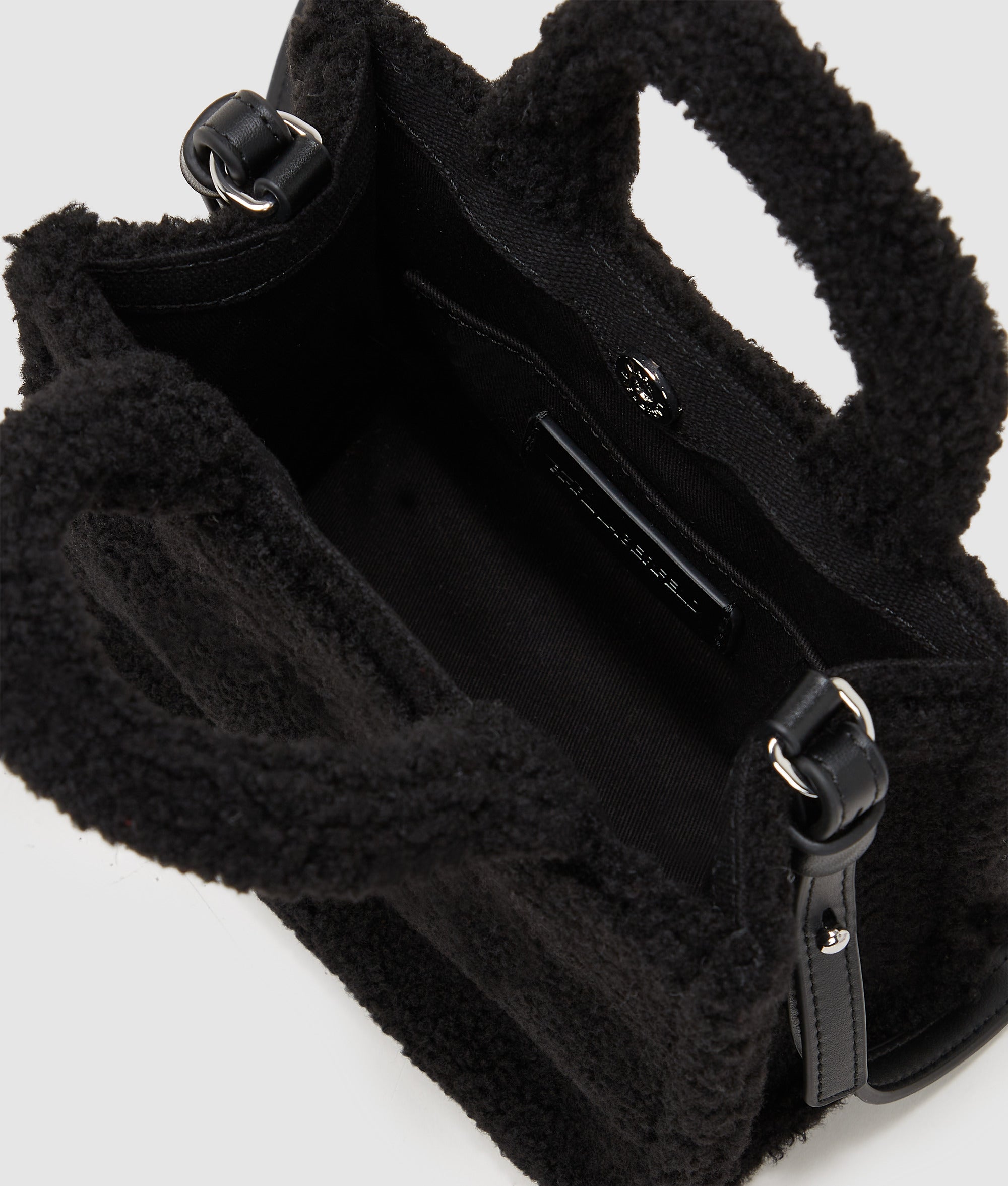 This compact tote bag features a cozy faux-shearling finish. perfect for winter accessorizing.