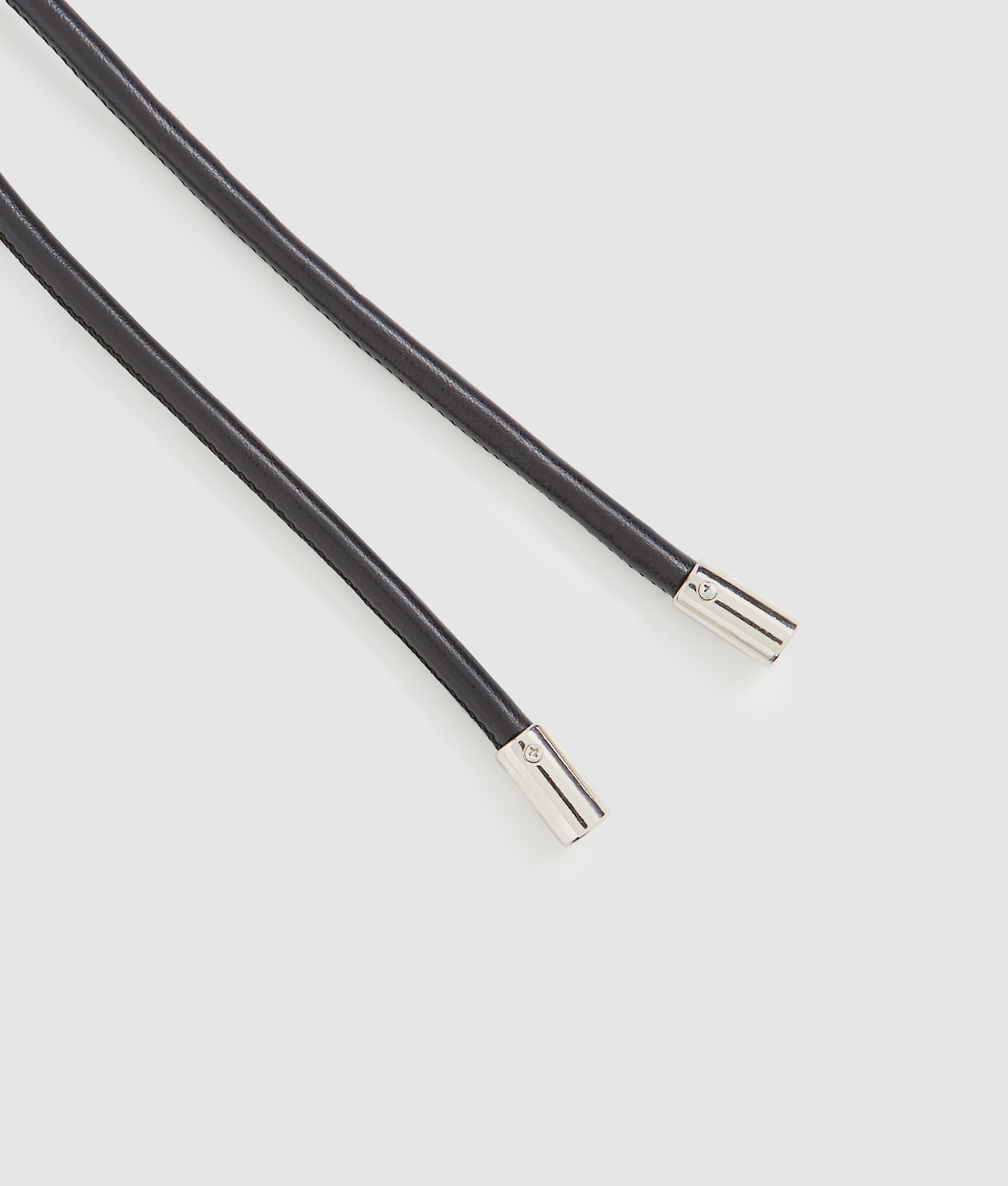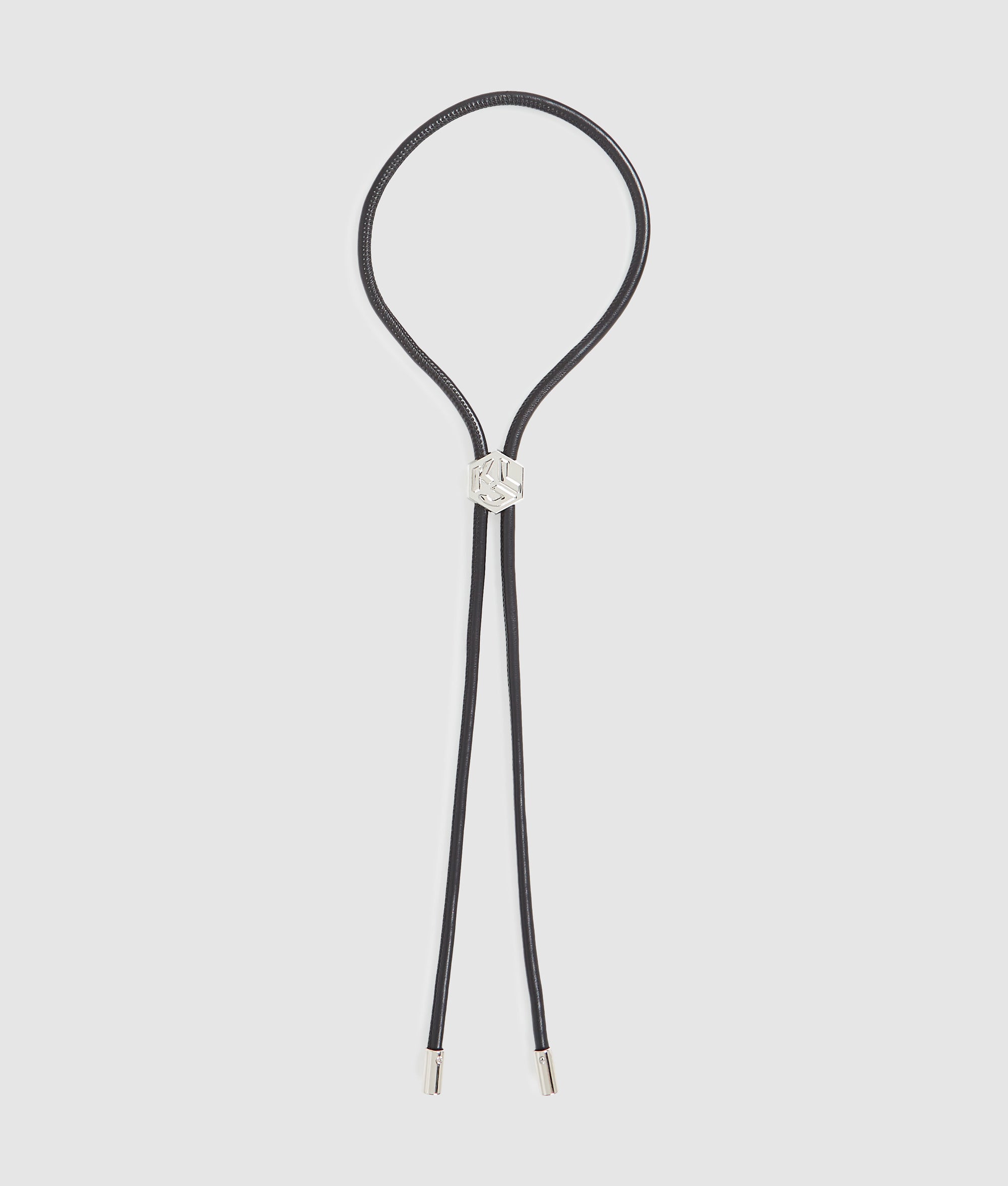Western roots. reworked. This bold necktie features a braided faux leather cord. tipped with metal and finished with an adjustable pendant. The KLJ Monogram adds signature edge.